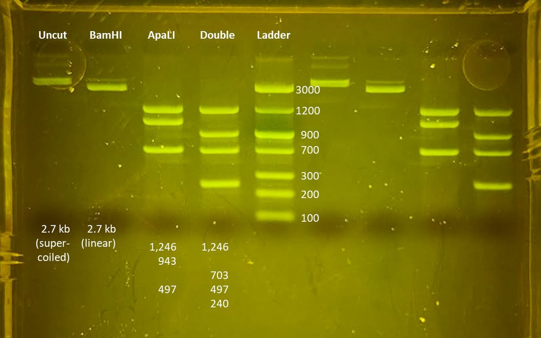 Die Lernenden werden mit zwei wichtigen Werkzeugen für die DNA-Analyse vertraut gemacht: Restriktionsplasmidkartierung und Gelelektrophorese. Die Lernenden analysieren Restriktionsverdaus mithilfe der Gelelektrophorese, um die Plasmidgröße sowie die Anzahl und ungefähre Position der Erkennungssequenzen von Restriktionsenzymen zu bestimmen.