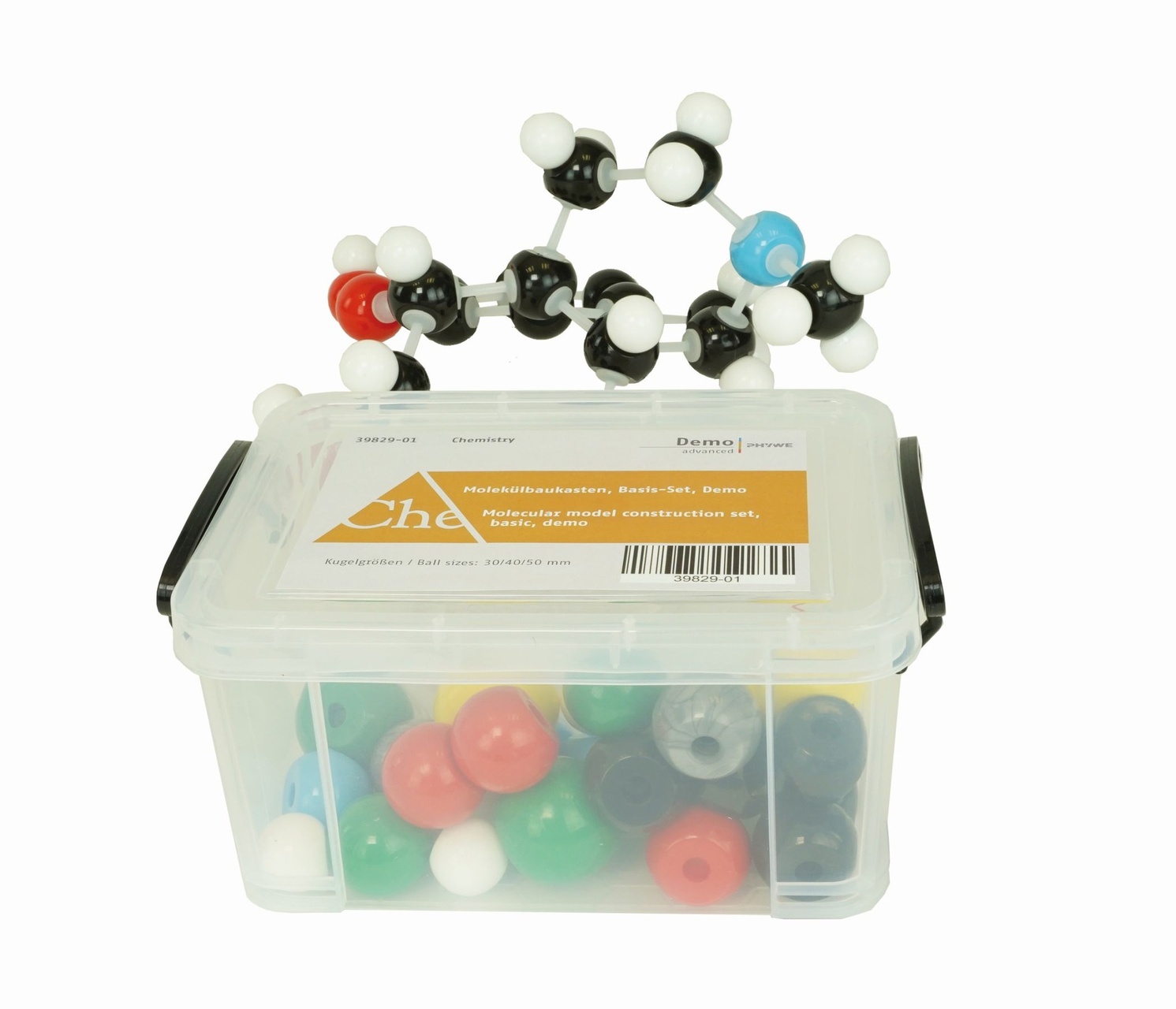 Reichlich bestückter Molekülbaukasten mit großen Kugeln von 30 (Wasserstoff), 40 (z.B. Kohlenstoff) und 50 mm Durchmesser (Chlor und Schwefel), ideal für den Frontalunterricht, zum Bauen offenkettiger (acyclischer) und ringförmiger (cyclischer) organischer Standardmoleküle in Form offener Kugel-Stab-Modelle oder als raumfüllende Kalottenmodelle, wie sie Thema in der Schule und in den Anfangssemestern der universitären Ausbildung sind; z. B.: Alkane, Alkene, Alkine, Alkohole, Amine, Halogenalkane, Mercaptane, u.v.a.m. Auch zur Untersuchung von unterschiedlichen Konformationen und Stereoisomeren geeignet.