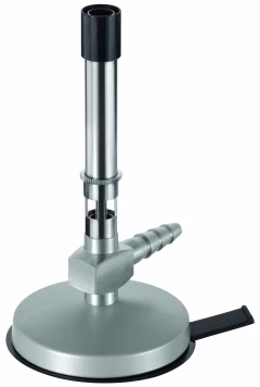 Bunsenbrenner nach DIN für Erdgas.(Hinweis: DIN-Brenner sind entsprechend der Norm 30665 nicht vollständig abstellbar. Daher brennt auch bei geschlossenem Gashahn bzw. Nadelventil eine kleine Flamme weiter. Die Gaszufuhr muss an der zentralen Absperrung im Labor abgestellt werden)