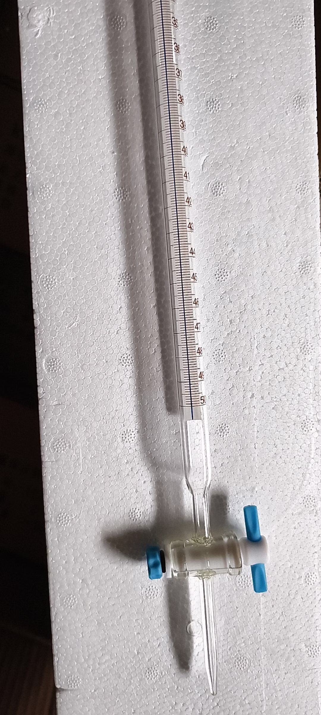 Bürette mit geradem PTFE-Hahn und Schellbachstreifen. Dank des chemikalienbeständigen PTFE-Hahns wird eine exakte Dosierung von Flüssigkeiten ermöglicht, während der Schellbachstreifen die Ablesegenauigkeit durch Kontrastverstärkung der Meniskuslinie verbessert.