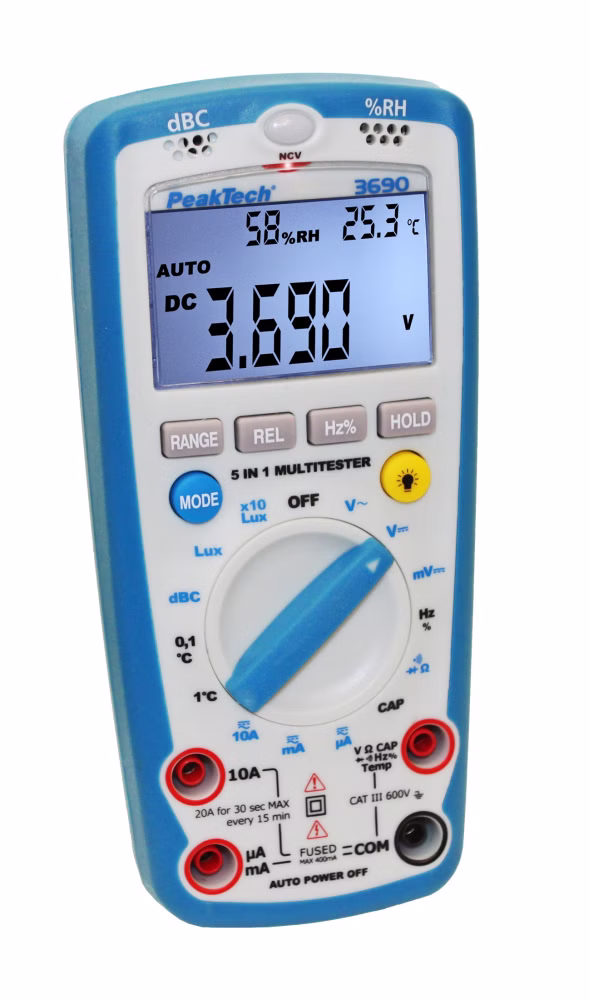 Dieser hochpräzise “5 in 1” Digital-Multitester wurde entwickelt, um die Umweltmessfunktionen Schallpegel, Beleuchtungsstärke, Luftfeuchtigkeit und Temperatur mit den Messfunktionen eines Multimeters zu kombinieren.
