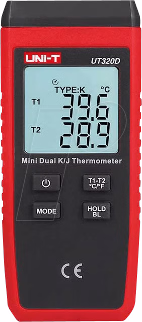 Hochgenaues Zweikanal-Kontaktthermometer mit großem Temperaturbereich für K- und J- Temperaturfühlern. Anzeige von zwei Temperaturen gleichzeitig möglich mit Differenzanzeige.