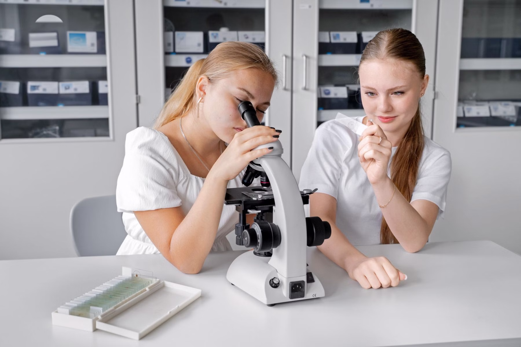 Modernes binokulares Schülermikroskop mit 400x Vergrößerung, Kreuztisch, LED-Beleuchtung und integriertem Akku.