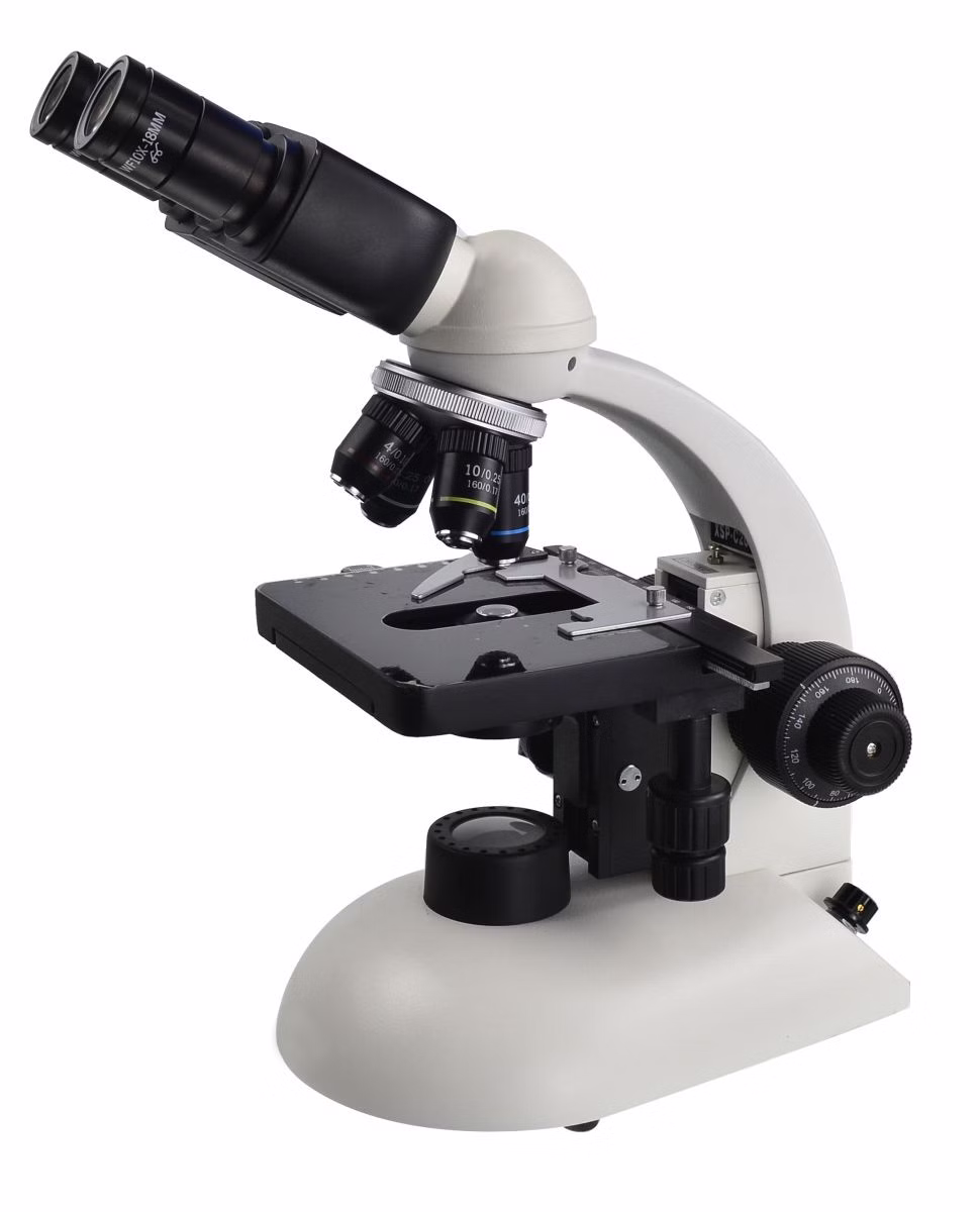 Modernes binokulares Schülermikroskop mit 600x Vergrößerung, Kreuztisch, LED-Beleuchtung und integriertem Akku.