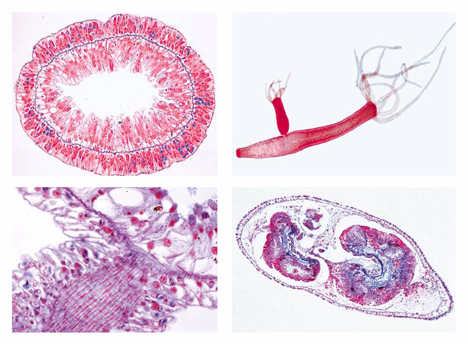 5350 Der Süßwasserpolyp (Hydra viridis). - 8 Präparate. 1. Hydra, Süßwasserpolyp, total 2. Hydra mit Knospen, total 3. Hydra, Querschnitte durch verschiedene Körperregionen 4. Hydra, Längsschnitt 5. Hydra mit Hoden, quer 6. Hydra mit Ovarium, quer 7. Hydra, isolierte Zellen. Zelltypen 8. Hydra mit Nahrung. quer