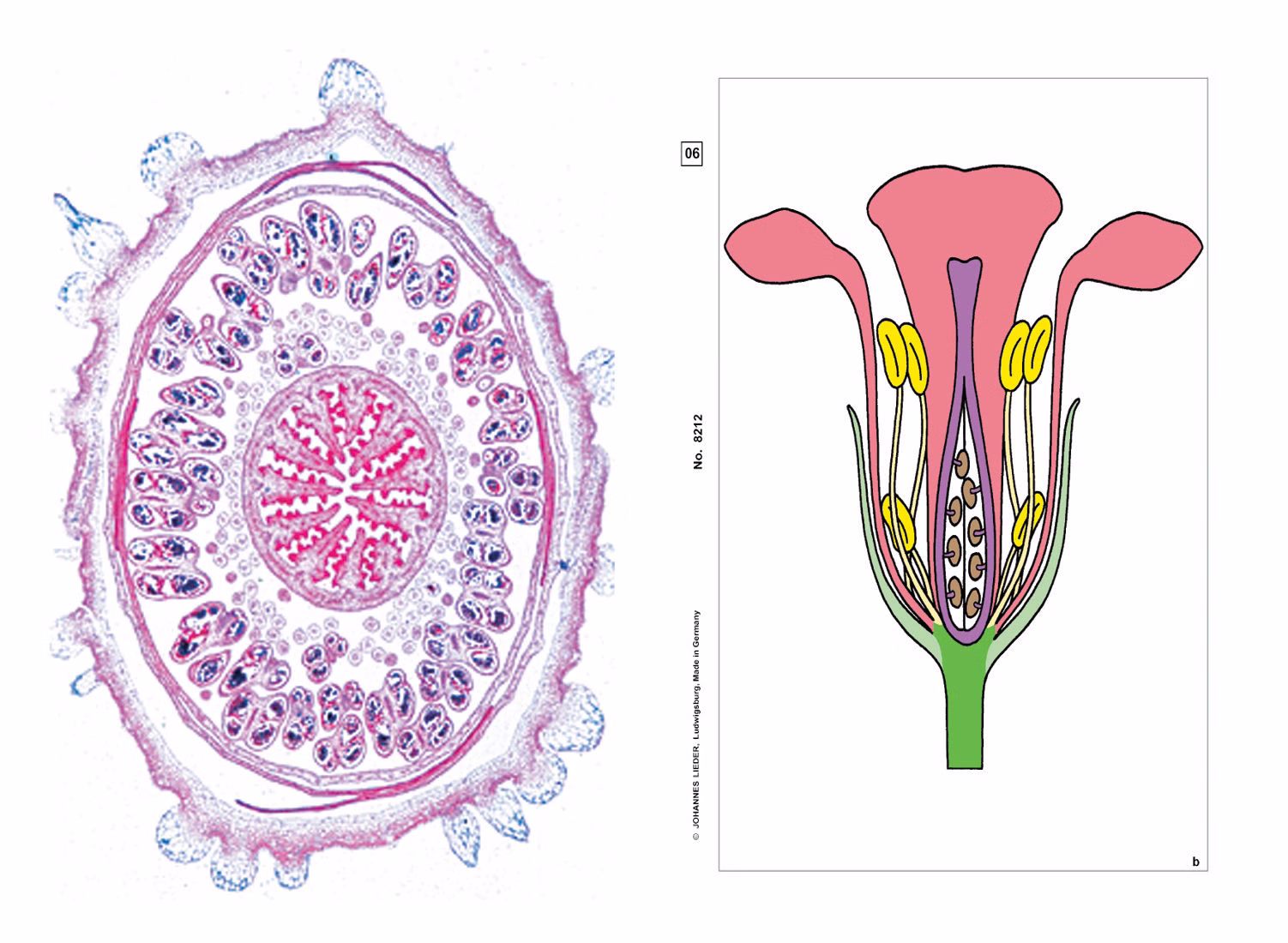 SMD-35 Multimedia-Lehrerpaket: Blütenpflanzen, Blüten und Früchte, Basissatz von 6 Präparaten. 6 Mikropräparate im Plastikkasten, 3 Farbige Overhead Transparente, 6 Arbeits- und Zeichenblätter als Kopiervorlagen, Textheft mit Erläuterungen, Aufbewahrungskarton. 1. Lilium candidum, Weiße Lilie, Blütenknospe quer. Blütendiagramm - 2. Lycopersicum, Tomate, Blütenknospe quer (Blütendiagramm). Syncarpes Gynaeceum mit axialer Placentation - 3. Lilium, Antheren quer, Übersichtspräparat. Staubbeutel mit Pollenkammern und Pollenkörnern - 4. Lilium, Fruchtknoten quer. Bau und Anordnung des Embryosacks, Übersichtspräparat - 5. Capsella bursa pastoris, Hirtentäschel, Samenkapsel (Schote) mit Embryonen in situ, Schnitt. Übersichtspräparat - 6. Triticum, Weizen, Samenkorn quer. Aleuronschicht, Endosperm, Embryo.