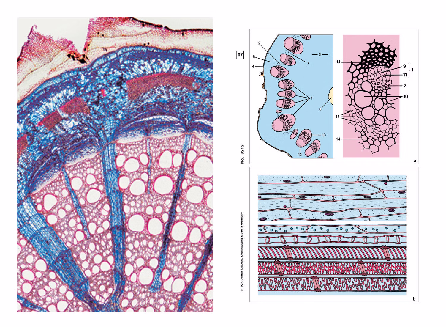 SMD-31 Multimedia-Lehrerpaket: Blütenpflanzen, Stamm und Stengel, Basissatz von 6 Präparaten. 6 Mikropräparate im Plastikkasten, 3 Farbige Overhead Transparente, 6 Arbeits- und Zeichenblätter als Kopiervorlagen, Textheft mit Erläuterungen, Aufbewahrungskarton. 1. Zea mays, Mais, typischer monokotyler Stamm mit zerstreuten Gefäßbündeln, quer. Geschlossene kollaterale Leitbündel - 2. Helianthus, Sonnenblume, typischer dikotyler Stamm quer. Offene kollaterale Leitbündel - 3. Cucurbita, Kürbis, Stamm mit Siebröhren und Gefäßen, längs - 4. Triticum, Weizen, Stamm (Halm) einer Graminee quer. Zentrale Markhöhle, ringförmige Anordnung der Leitbündel - 5. Elodea, Wasserpest, Stamm mit Aerenchym, quer. Reduziertes Leitbündel einer Wasserpflanze - 6. Convallaria, Maiglöckchen, Rhizom quer. Konzentrische Leitbündel.