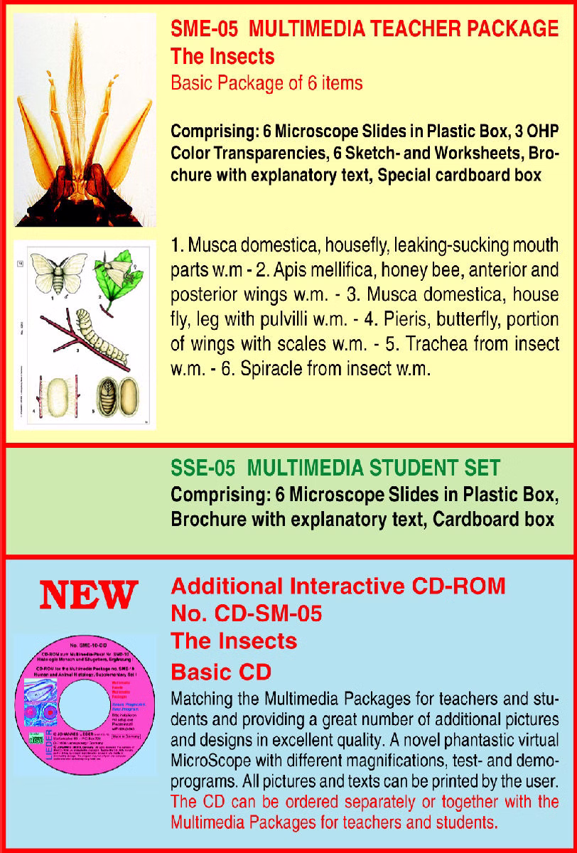 SSD-05 Multimedia-Schülersatz: Insekten, Basissatz von 6 Präparaten. 6 Mikropräparate im Plastikkasten, Textheft mit Erläuterungen, Aufbewahrungskarton. 1. Musca domestica, Stubenfliege, Kopf und Mundwerkzeuge - 2. Apis mellifica, Honigbiene, Vorder- und Hinterflügel - 3. Musca domestica, Stubenfliege, Bein total. Haftballen - 4. Pieris, Schmetterling, Stück vom Flügel mit Schuppen - 5. Tracheen vom Insekt. Verzweigte Atemröhren. - 6. Stigma vom Insekt. Atemöffnungen der Insekten.