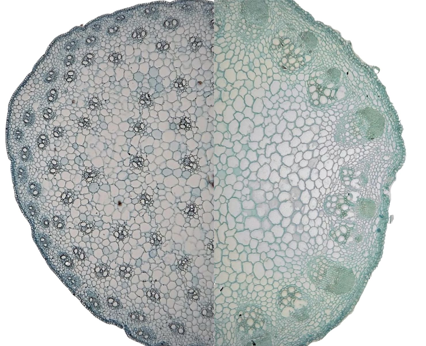 10 identische Mikropräparate "Stengelquerschnitt einer dikotylen und einer monokotylen Pflanze als Klassensatz im Aufbewahrungskasten. Beide Stengelquerschnitte befinden sich auf dem selben Objektträger.