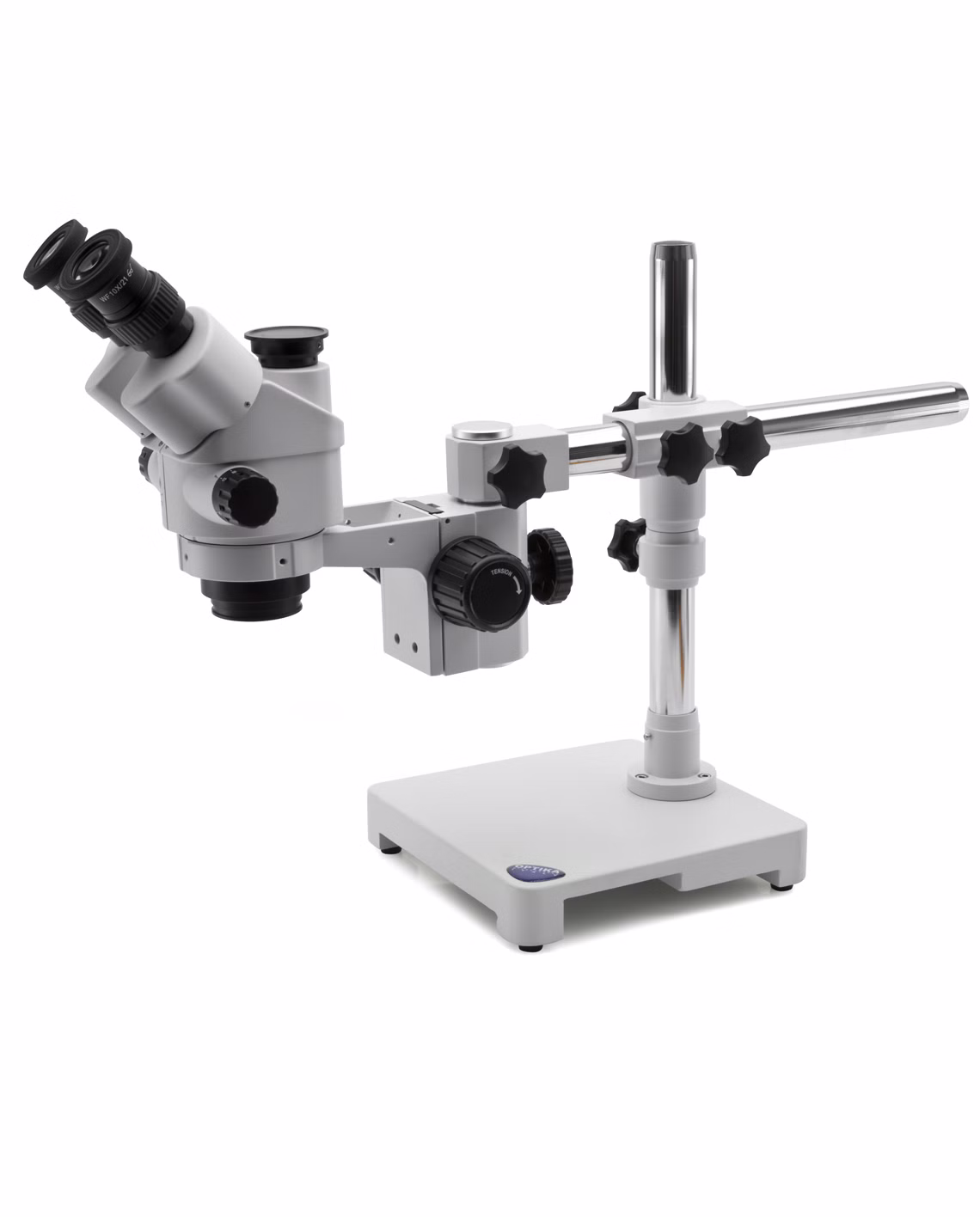 Trinokulares Stereomikroskop mit extrem stabilem, überhängendem Stativ, komplett mit Kopfhalterung und Fokussiersystem für die rechtwinklige Betrachtung besonders großer Proben. Eine gleichmäßige horizontale und vertikale Bewegung ist gewährleistet.