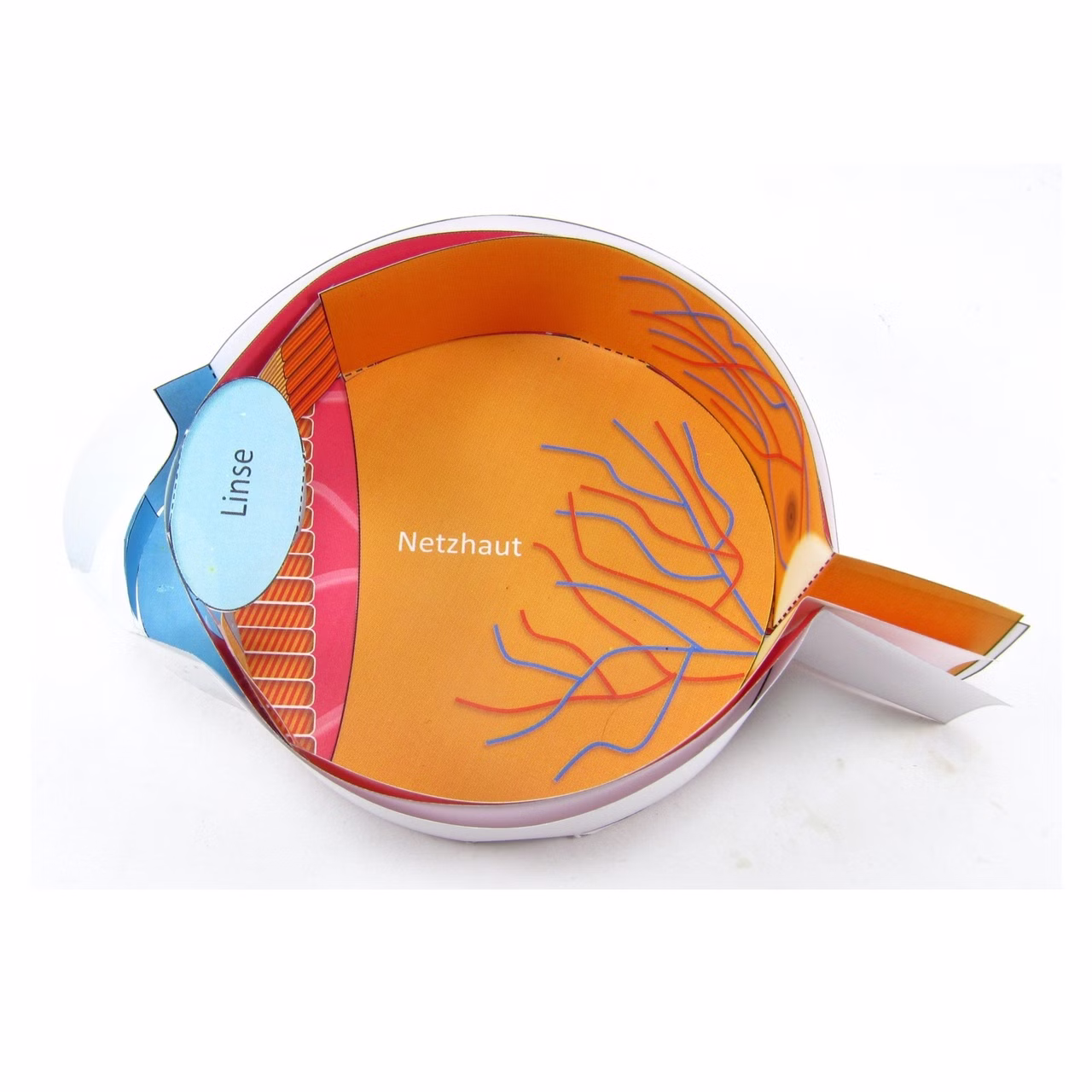Das Modell umfasst die Hauptbestandteile des Auges: die äußere Schicht (Lederhaut), die mittlere Schicht (Aderhaut) und die innere Schicht (Netzhaut), Hornhaut, Iris, Pupille, Linse, Sehgrube, Sehnerv, Ziliarkörper, Linsenbänder und blinder Fleck (Papille).