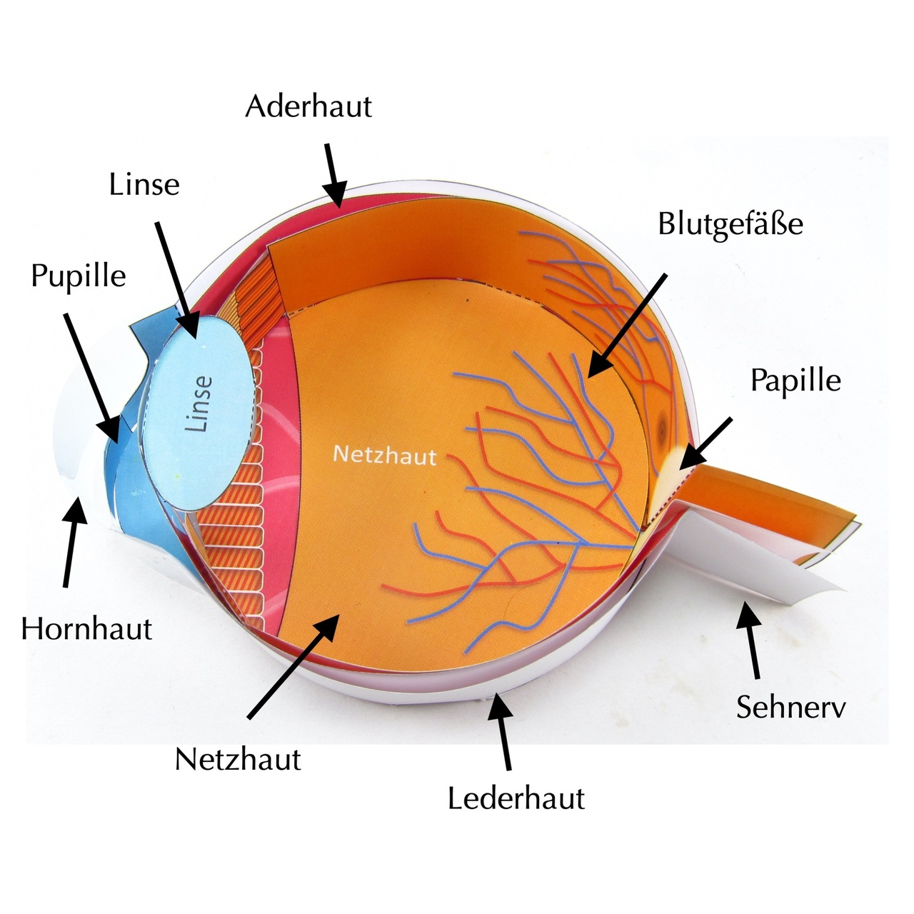 Das Modell umfasst die Hauptbestandteile des Auges: die äußere Schicht (Lederhaut), die mittlere Schicht (Aderhaut) und die innere Schicht (Netzhaut), Hornhaut, Iris, Pupille, Linse, Sehgrube, Sehnerv, Ziliarkörper, Linsenbänder und blinder Fleck (Papille).