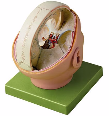 natürliche Größe, aus SOMSO-Plast®. Darstellung der Duraverhältnisse und Sinus durae matris. Die 12 Hirnnervenpaare und die Arteria basilaris mit Verzweigungen sind freigelegt. Auf grünem Sockel. 2teilig.