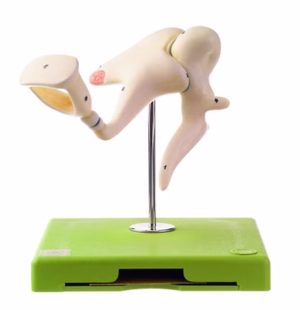 nach Prof. Dr. Neubert, ca. 19fach vergrößert, aus SOMSO-Plast®. Bestehend aus Hammer, Amboß und Steigbügel. In 3 Teile zerlegbar. Auf Stativ mit grünem Sockel.