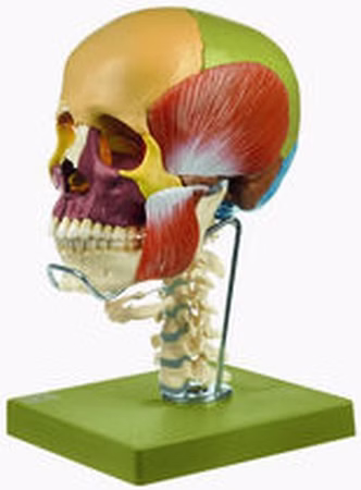 natürliche Größe, aus SOMSO-Plast®, nach Prof. Dr. Dr. med. J. W. Rohen, Anatomisches Institut der Universität Erlangen. Ausführung wie QS 8/3, jedoch mit den 4 Kaumuskeln, der Halswirbelsäule und dem Zungenbein.