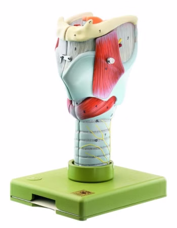 ca. 2fach vergrößert, aus SOMSO-Plast®. Durch Medianschnitt in 2 Hälften zerlegbar. Zum Abnehmen sind: der rechte Schildknorpel, M. cricothyroideus und M. thyrohyoideus. Innere und äußere Kehlkopfmuskulatur, Schleimhautrelief, Arterien- und Nervenversorgung und das Knorpelskelett können demonstriert werden. Insgesamt in 5 Teile zerlegbar. Auf Stativ mit grünem Sockel.