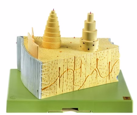 vielfach vergrößert, aus SOMSO-Plast®. Darstellung an einem Keil- segment aus der Kompakta eines Röhrenknochens. Gezeigt sind u. a. Haverssche Lamellen, äußere Generallamelle, Schaltlamellen etc. Unzerlegbar. Auf grünem Sockel.