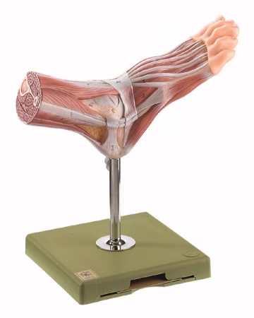 natürliche Größe, aus SOMSO-Plast®. Die oberflächlichen Muskeln darstellend. Unzerlegbar. Auf Stativ mit grünem Sockel.