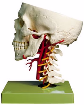 Naturabguß aus SOMSO-Plast®, bestehend aus Schädelbasis, Unterkiefer und Halswirbelsäule mit Nerven. Darstellung der Halsarterien mit Durchtritt durch die Schädelbasis mit Schwerpunkt Arteria basilaris mit komplettem Circulus arteriosus cerebri Willisi. Unzerlegbar. Beweglich auf Stativ mit grünem Sockel.