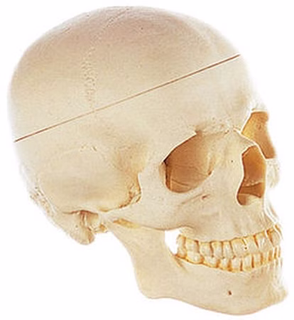 Naturabguß, aus SOMSO-Plast®. Schädeldach abnehmbar, Unterkiefer beweglich. In 3 Teile zerlegbar. Zum Studium für Medizinstudenten geeignet. Umfang 51,2 cm.