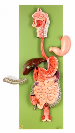 natürliche Größe, Reliefmodell, aus SOMSO-Plast®. Ausführung wie JS 2/1, jedoch mit Magen zum Öffnen. In 3 Teile zerlegbar. Auf grüner Grundplatte.