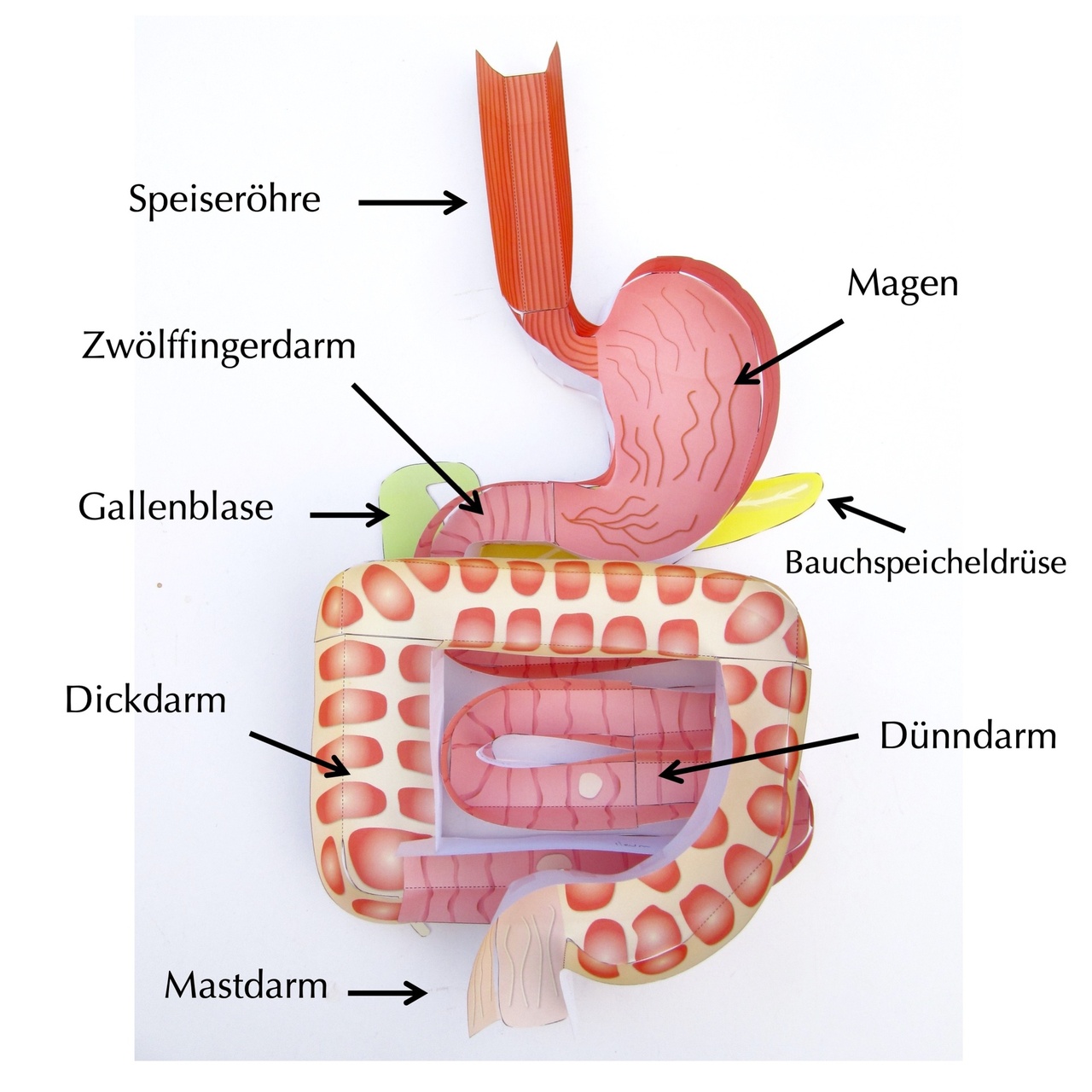 Die Schüler bauen ihr Verdauungssystem aus den farbigen Teilen entweder allein oder in kleinen Gruppen. Dann können sie ihr Modell verwenden, um die einzelnen Teile des Verdauungssystems zu identifizieren, u. a. Speiseröhre, Magen, Dünndarm, Dickdarm, Gallenblase und Bauchspeicheldrüse.