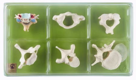 Naturabguß, aus SOMSO-Plast®. Bestehend aus: 1. Lendenwirbel, 2. Brustwirbel, 3. Halswirbel, 4. Atlas, 5. Axis, 6. Halswirbel mit Rückenmark und Nervenabzweigungen, mit Erläuterung, 7. Zwischenwirbelscheibe (Bandscheibe). In einer durchsichtigen Staubschutzschachtel mit Fächereinteilung, herausnehmbar.