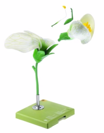 Pisum sativum, ca. 9fach vergrößert, aus SOMSO-Plast®. Nach Prof. Dr. Weber. In 6 Teile zerlegbar. Auf Stativ mit grünem Sockel.