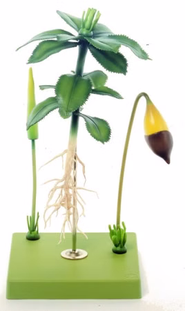 Mnium affine, ca. 12fach vergrößert, 6teilig, aus SOMSO-Plast®. Nach Prof. Dr. Weber. Das reife Sporogon mit Seta kann gegen ein noch unreifes Sporogon mit Seta, gegen einen Antheridienstand oder gegen einen Archegonienstand ausgewechselt werden. Die Kalyptra auf dem reifen Sporogon ist abnehmbar. Auf Stativ.
