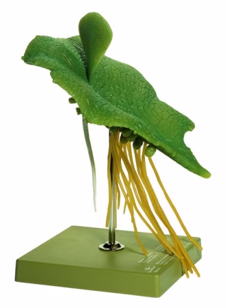 Dryopteris filix-mas, ca. 45fach vergrößert, aus SOMSO-Plast®. Nach Prof. Dr. Weber. Das Prothallium trägt an seiner Unterseite je eine Gruppe von Antheridien und Archegonien sowie zahlreiche Rhizoide, die der Befestigung am Boden dienen. Aus der befruchteten Eizelle eines Archegoniums hat sich ein Farnpflänzchen entwickelt, das aus einem jungen Blättchen und einer ersten Wurzel besteht. Unzerlegbar. Auf Stativ mit grünem Sockel.