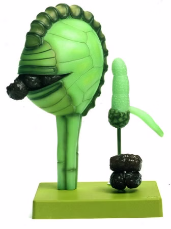 Dryopteris filix-mas, ca. 550fach bzw. 850fach vergrößert, aus SOMSO-Plast®. Nach Prof. Dr. Weber. Ein Teilmodell zeigt ein Sporangium im Moment der Öffnung. Daneben sind eine Sporentetrade und eine zum Prothallium auskeimende Spore stärker vergrößert dargestellt. Unzerlegbar, auf grünem Sockel.