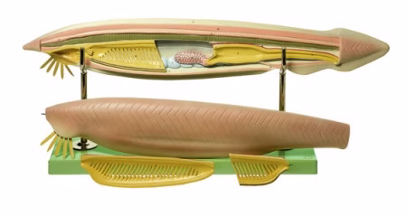 Branchiostoma lanceolatum, ca. 150fach vergrößert, aus SOMSO-Plast®. Das zerlegbare Modell zeigt den Körperbau eines erwachsenen Tieres: Flossensäume, Muskelsegmente, Lage der Gonaden, das Nervensystem, die Chorda, Darm und Blutgefäßsystem. Insgesamt 3teilig. Auf Stativ mit grünem Sockel.