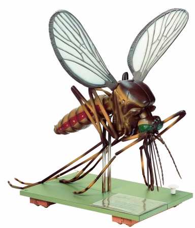 Gemeine Stechmücke, Culex pipiens, im Maßstab 1:50 vergrößert, aus SOMSO-Plast®. Nach Dr. E. Schicha. In 7 Teile zerlegbar. Auf ausziehbarem grünem Sockel, um die inneren Organe zu zeigen.