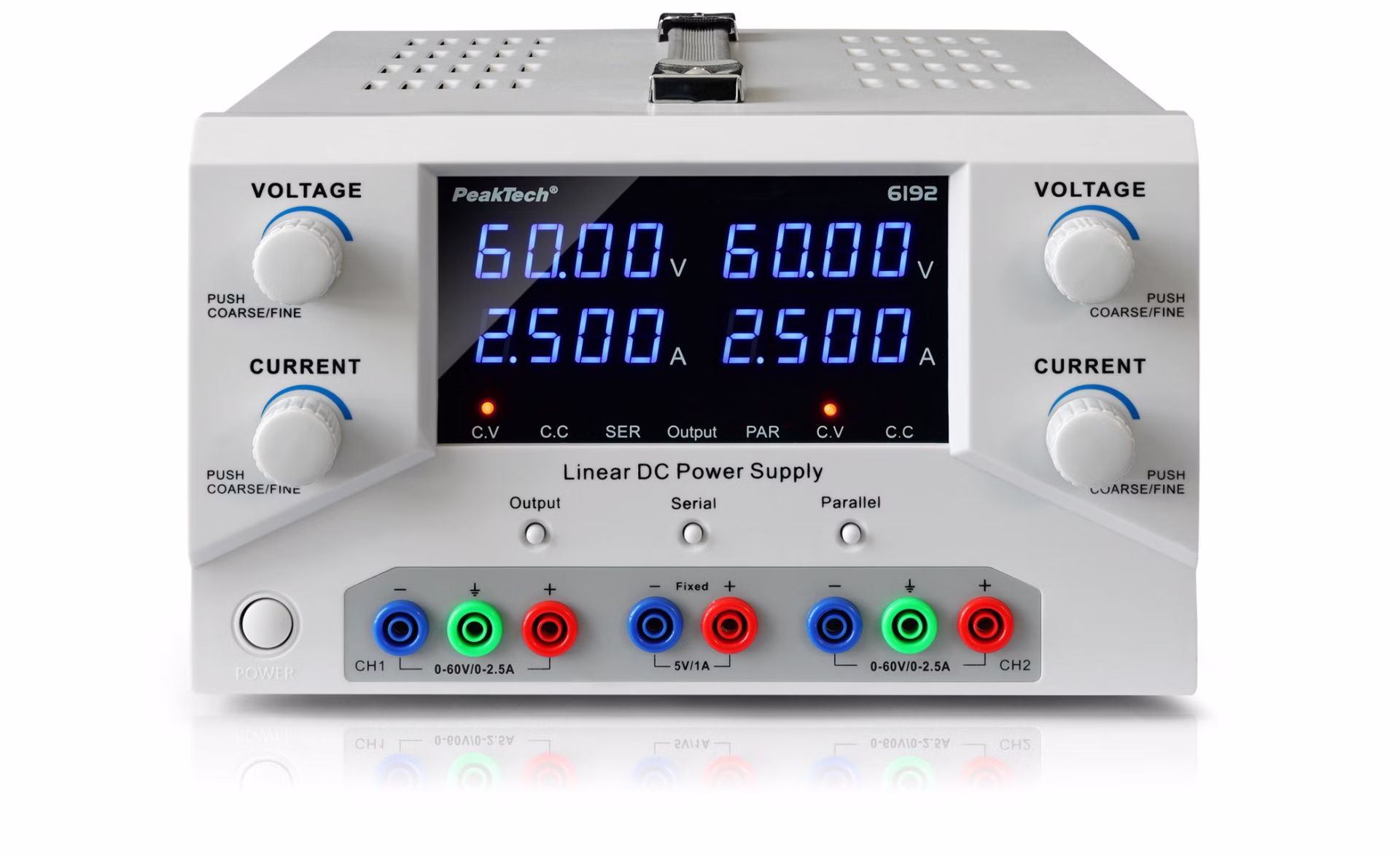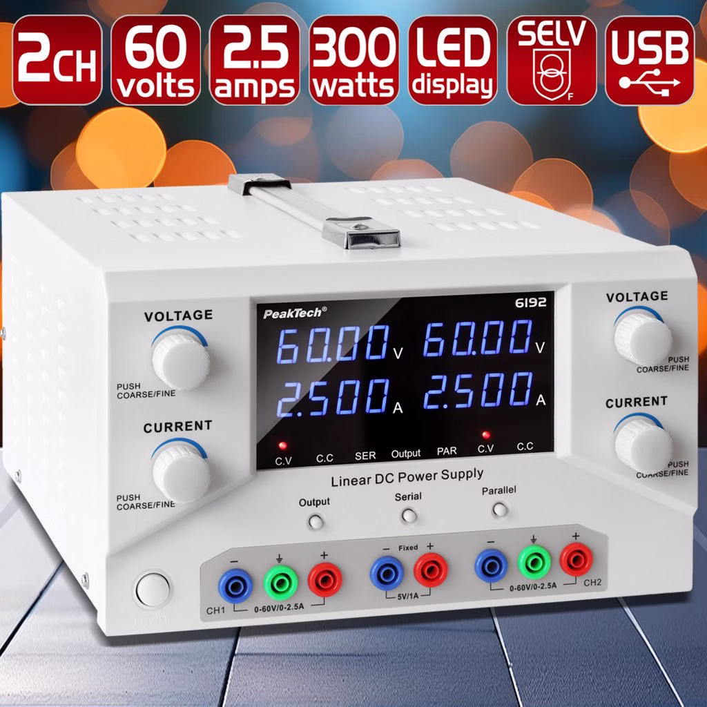 Dieses linear geregelte 2-Kanal Labornetzgerät bietet zuverlässige Leistung und hohe Sicherheit dank eines integrierten Sicherheitstransformators. Mit einem regelbaren Ausgang von 0 - 60 V und 0 - 2,5 A DC ist es vielseitig einsetzbar und ideal für verschiedene Anwendungen in Labor und Werkstatt. Es verfügt über eine Stromvorwahl, die es ermöglicht, den gewünschten Stromwert einzustellen, bevor die Last angeschlossen wird. Die vierstelligen LED-Anzeigen in Blau zeigen Spannung, Strom und Leistung deutlich und präzise an. Der Output-Taster gibt die gewählten Einstellungen erst nach dem Einstellen an den Ausgang aus, was unbeabsichtigte Änderungen verhindert und zusätzliche Sicherheit bietet. Der temperaturgesteuerte Lüfter passt sich automatisch an die Temperatur des Geräts an, was für eine effiziente Kühlung und einen leisen Betrieb sorgt. Mit vier Potentiometern für Strom und Spannung können die gewünschten Ausgangswerte schnell und präzise eingestellt werden. Zusätzlich bietet dieses Modell eine USB-Schnittstelle zur Fernsteuerung und dem Auslesen über einen PC.