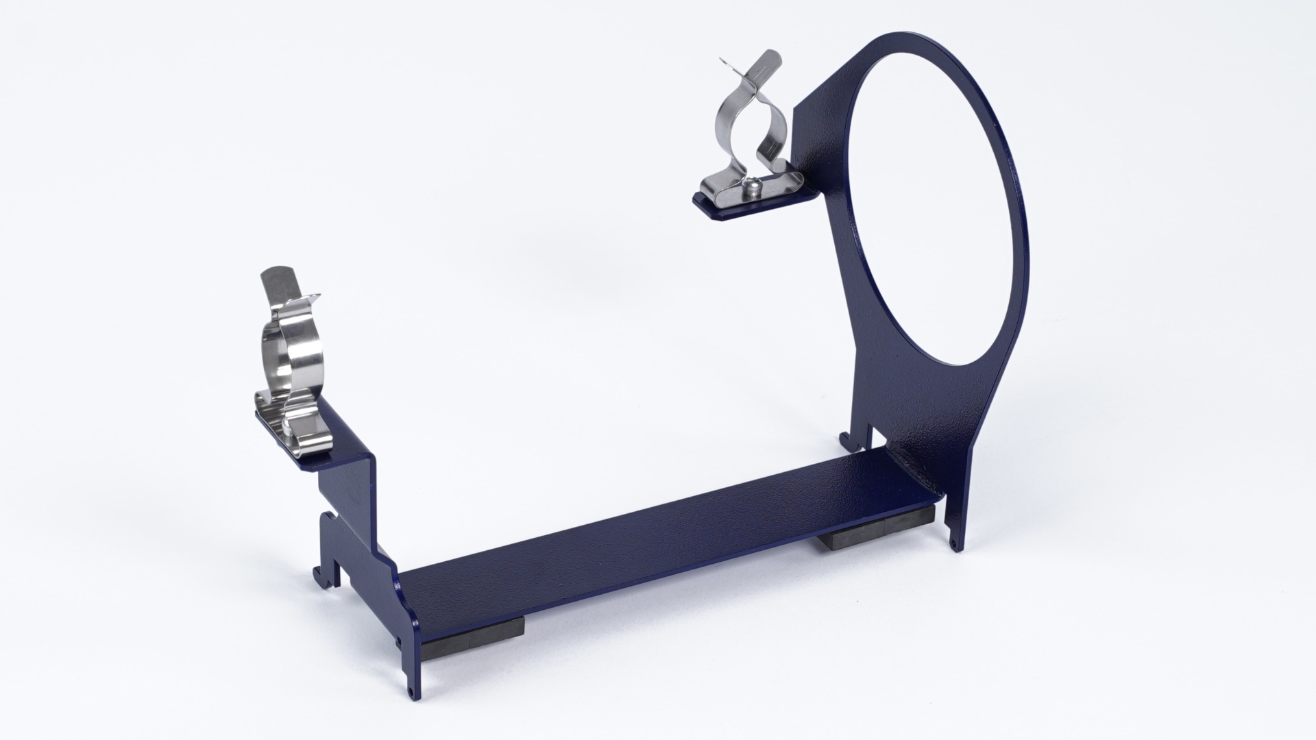 Mit dem Halter für Glasmantel kann der Glasmantel (02615-00) an der Platte für Komplettversuche befestigt werden. Dazu wird der Glasmantel mit den darin montierten Zusatzgeräten in den Halter eingeschoben und in die beiden Federklemmen eingeklinkt.
