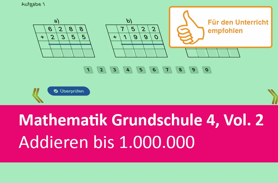 Das interaktive Arbeitsheft Mathematik, 4. Jahrgangsstufe, Volume 2 enthält 50 didaktisch aufbereitete Aufgaben und Videos. Die Inhalte dieses digitalen Arbeitshefts sind ohne zusätzliche Software verwendbar und mit allen internetfähigen Endgeräten einsetzbar.