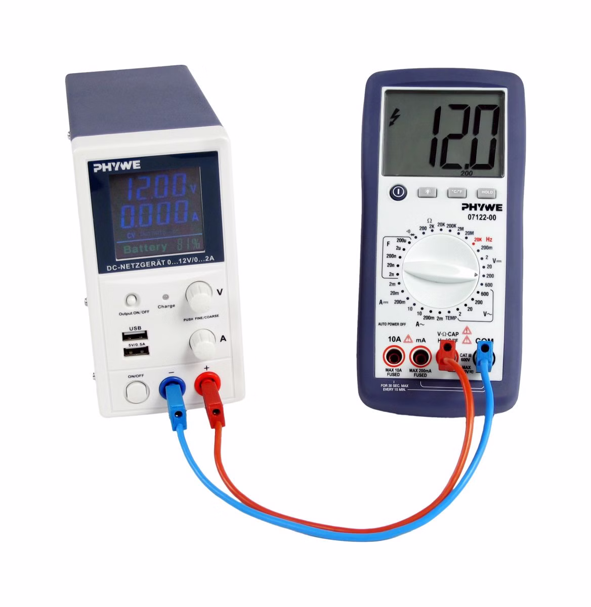 Das Set besteht aus dem PHYWE Akku-Schülernetzgerät to go, RiSU 2023 DC 0...12 V / 0...2 A (Artikelnr. 13510-99) und dem PHYWE Digitalmultimeter, 600V AC/DC, 10A AC/DC, 20 MOhm, 200µF, 20 kHz, -20°C…760°C (07122-00).