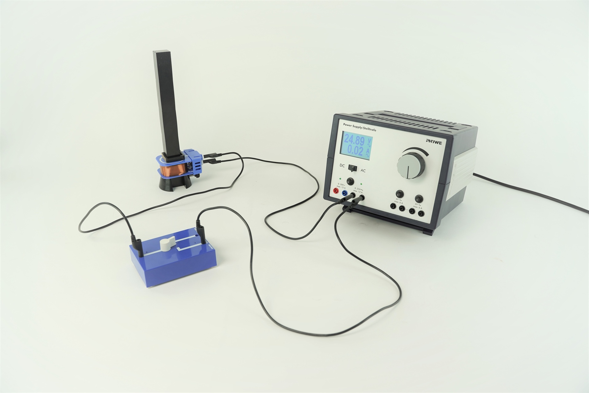 In diesem Versuch wird die Kraftwirkung auf einen geschlossenen Leiter demonstriert, in dem ein Strom induziert wird. Bei Verwendung von Gleichstrom in der Primärspule, erfolgt bei Einschalten ein Kraftstoß und der Ring fliegt weg. Bei Wechselstrom schwebt der Ring über der Primärspule.