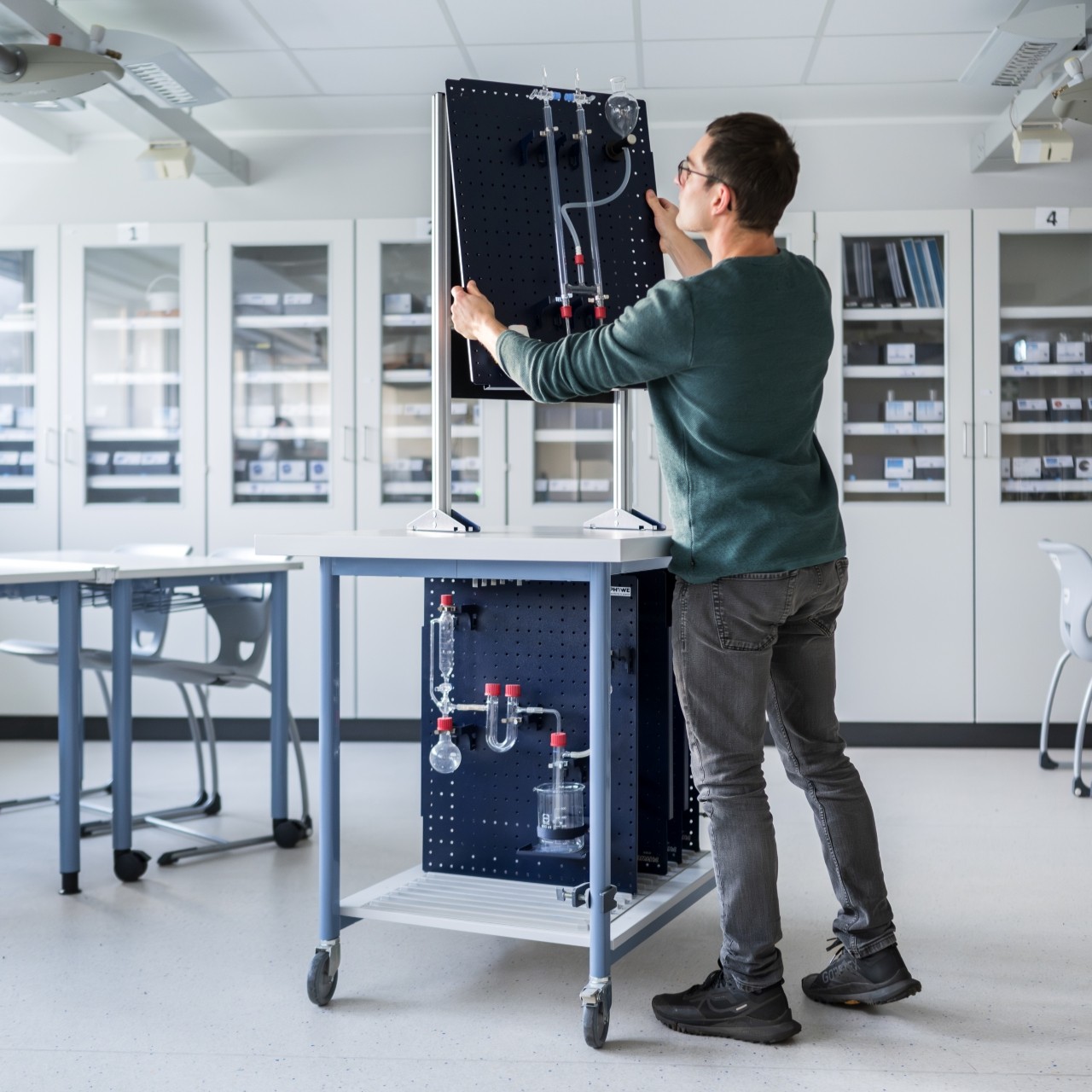 Die Geräte für die Aufbauten werden mit Hilfe von dafür vorgesehenen Haltern magnetisch oder über ein regelmäßiges Lochraster auf der Platte befestigt und sehr variabel auf der Platte positioniert. Die Platte selbst wird in eine Nut des oberen Querträgers des Rahmens für Komplettversuche (45500-00) eingehängt, was sowohl hochkant als auch im Querformat funktioniert.