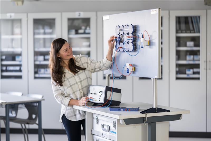 Beidseitig verwendbare Tafel, um magnetisch haftende Komponenten anzubringen und in den Unterricht einzubinden. Die Tafeloberfläche mit ihrer magnetischen Oberfläche ermöglicht das einfache Anbringen von magnetischen Elementen für eine interaktive Darstellung von Konzepten oder Versuchsaufbauten.