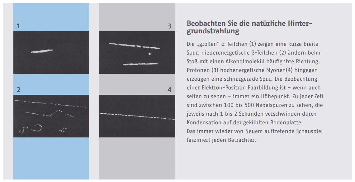 Kontinuierlich arbeitende, maschinengekühlte Kammer zur Sichtbarmachung der Bahnen radioaktiver Strahlung. Sie eignet sich besonders für Demonstrationen, den Unterricht sowie für Ausbildungszwecke und ermöglicht eine anschauliche Beobachtung von Teilchenspuren in Echtzeit.