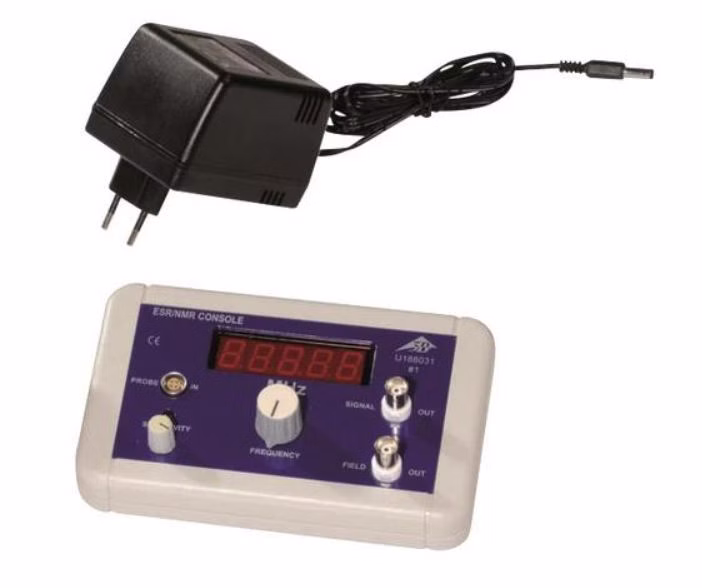 ESR / NMR Steuerkonsole zur Untersuchung der Elektronenspinresonanz (ESR) am ungepaarten Elektron von DPPH- (Diphenyl-Picryl-Hydrazyl-)Molekülen sowie der kernmagnetischen Resonanz (NMR) beispielsweise an Glycerin, Polystyrol und Teflon. Die Beobachtung der Resonanzen erfolgt durch hochfrequenzinduzierte Übergänge bei Veränderung des externen Magnetfeldes. Die Resonanzabsorptionskurven können mit einem einfachen Zweikanal-Oszilloskop dargestellt werden.