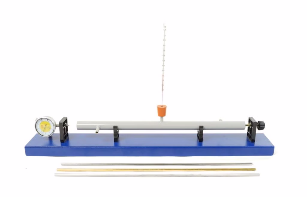 Zur quantitativen Messung der Längenausdehnung fester Körper in Abhängigkeit von Material, Länge und Temperatur. Messrohre werden auf der Grundplatte eingespannt und mit durchströmendem Wasser oder Dampf erwärmt.