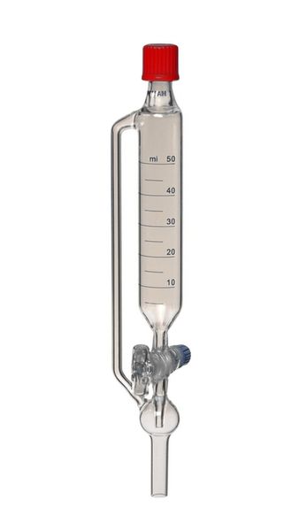 Funktion und Verwendung Trichter für Gleichdruckgasentwickler, graduiert mit Hahn und Ansatzstutzen, mit Verschlusskappe GL 18. Ausstattung und technische Daten