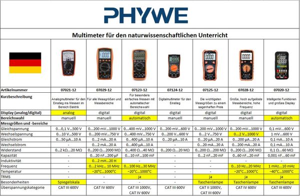 Unknown Funktion und Verwendung Digitales Multimeter für die Messung von Gleich- und Wechselspannung, Gleich- und Wechselstrom, Widerstand, Kapazität, Frequenz und Temperatur mit großen, hoch aufgelösten Messbereichen und hoher Frequenz. Ausstattung und technische Daten 3 ½-stellige LCD-Anzeige, 28 mm, mit Hintergrundbeleuchtung Gleichspannung: 200mV / 2V / 20V / 200V / 1000V Wechselspannung: 2V / 20V / 200V / 1000V Gleichstrom: 200µA / 2mA / 20mA / 200mA / 2A / 20A Wechselstrom: 200mA / 2A / 20A Widerstand: 200Ω / 2kΩ / 20kΩ / 200kΩ / 2MΩ / 20MΩ / 200MΩ Kapazität: 60nF / 600nF / 6µF / 60µF / 600µF / 6mF / 20 mF Frequenz: 10Hz / 100 Hz / 1kHz /10kHz / 100kHz / 1MHz / 20MHz Temperatur: -20...1000℃ Eingangsimpedanz: 10MΩ, Abtastrate: 3 mal/s, AC-Frequenzgang: 40-1000Hz, max. Anzeige: 1999, LCD-Größe: 70×50mm TrueRMS, Dioden-/Transistortest, Triode hEE, Kontinuitätssummer, Hintergrundbeleuchtung, Data Hold, automatische Abschaltung, Funktionsschutz, 200mA-Schutz, Rechteckwellenausgang Enthaltenes Zubehör: 1,5V AAA LR03-Batterien (4x), Messleitungen, Gebrauchsanweisung Maße: 186 x 92 x 52 mm Gewicht: 400 g |