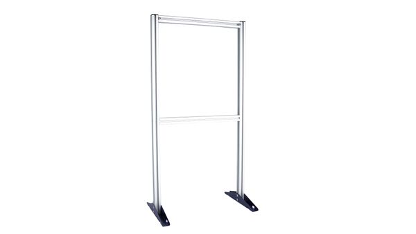 Rahmen für Komplettversuche aus Aluminiumprofil mit stabilen Standfüßen aus blau lackiertem Stahlblech.