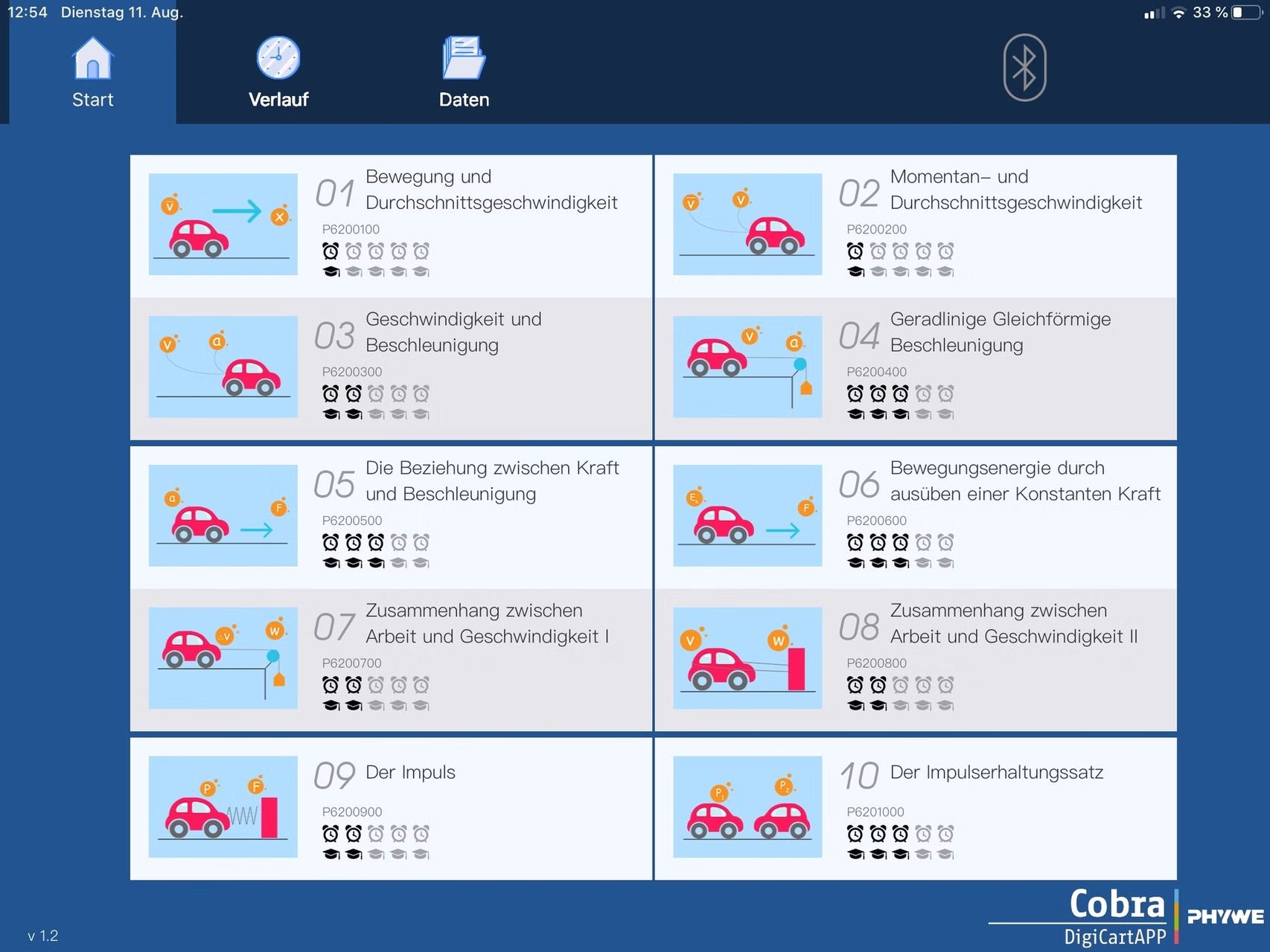 Wie verhält sich ein gleichmäßig beschleunigtes Fahrzeug? Was passiert, wenn ein Fahrzeug abgebremst wird? Antworten auf diese und viele weitere Fragen enthalten Sie über die 12 integrierten Versuchsbeschreibungen, die Sie mit dem Cobra DigiCart und der PHYWE DigiCartAPP durchführen können.