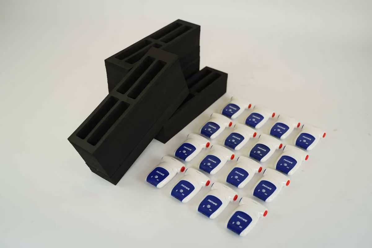Zweigeteilter Aufbewahrungsblock - passgenauer Schaumeinsatz zur geschützten Lagerung von 16 kleineres Sensoren wie Light, 12 mittelgroßen Sensoren wie beispielsweise Strom oder Spannung oder für 8 große Sensoren wie Force&Acceleration.