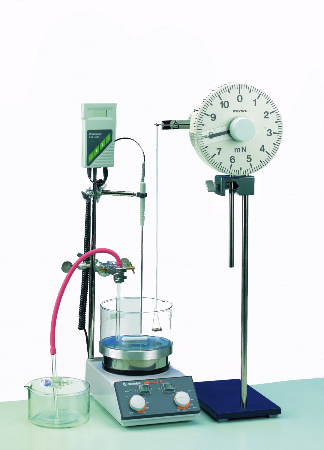 Ein Metallring, der am Torsionskraftmesser befestigt ist, befindet sich zunächst unterhalb der zu testenden Flüssigkeitsoberfläche. Durch Absenken des Vorratsgefäßes wird der Ring solange kontinuierlich aus der Flüssigkeitsoberfläche herausgezogen, bis die am Ring anhaftende Flüssigkeitslamelle reißt. Die in diesem Moment wirkende Kraft wird gemessen.