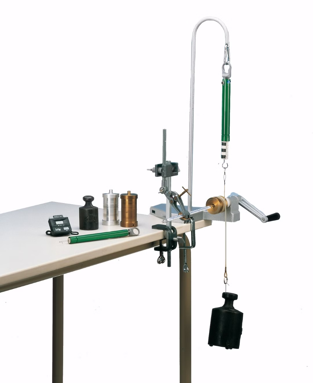 In diesem Versuch wird ein Metall-Testkörper gedreht und durch die Reibung wird ein gespanntes Band aus synthetischem Material erhitzt. Das mechanische Wäremequivalent wird durch die definierte mechanische Arbeit und dem thermischen Energieanstieg der von dem Temperaturanstieg abgeleitet wird, bestimmt. Ausgehend von der Gleichwertigkeit mechanischer Arbeit und Wärme, wird die spezifische Wärmekapazität von Aluminium und Messing berechnet.